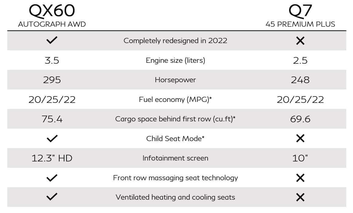 See how the Audi Q7 45 Premium Plus compares to the INFINITI QX60 Autograph AWD’s forward-thinking innovation and sophistication.