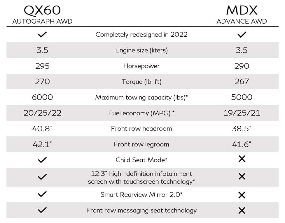 Like the QX60, the Acura MDX was recently re-designed. We’re taking two similar trims to see how the INFINITI QX60 Autograph AWD compares to the Acura MDX Advance AWD.
