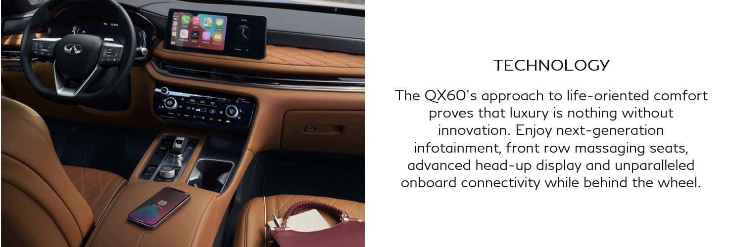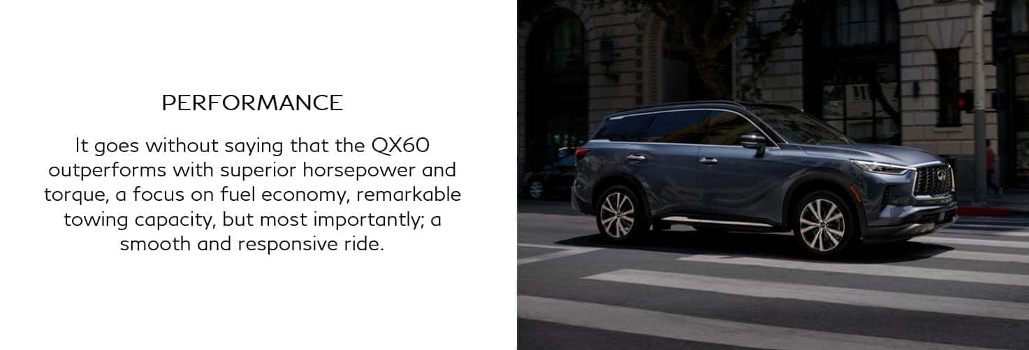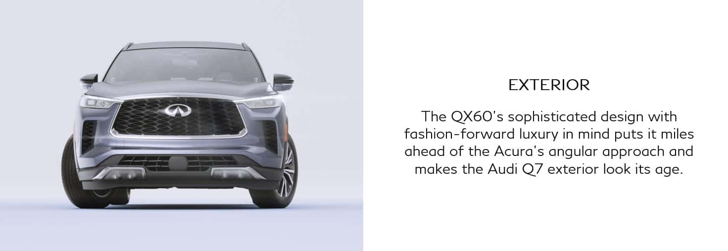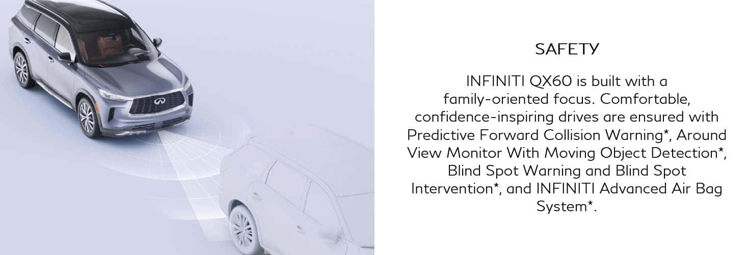 Disclaimers: 1. Comparison based on 2023 INFINITI QX60 AUTOGRAPH AWD vs. 2023 Acura MDX Advance AWD. Based on Competitor’s website. 2. Comparison based on 2023 INFINITI QX60 AUTOGRAPH AWD vs. 2023 Audi Q7 45 Premium Plus. Based on Competitor’s website. 3. Smart RearView Mirror may not detect every object and does not eliminate blind spots or warn of moving objects. See Owner’s Manual for safety information. 4. Driver Attention Alert cannot provide a warning in every situation. See Owner’s Manual for safety information. 5. Rear Door Alert System does not detect people or cargo. Always check rear seat before exiting. See Owner’s Manual for safety information. 6. Information displayed is dependent on how the vehicle is equipped. Do not use for extended periods of time. See Owner’s Manual for important safety information. 7. Predictive Forward Collision Warning cannot prevent collisions. See Owner’s Manual for safety information. Based on manufacturers websites. 8. Around View Monitor with Moving Object Detection cannot eliminate blind spots and may not detect every object. Driver should always turn and check surroundings before driving. See Owner’s Manual for safety information. 9. Blind Spot Intervention cannot prevent all collisions and may not detect every object or warn in all situations. Driver should always turn and look before changing lanes. See Owner’s Manual for safety information. Available feature. 10. Do not perform slide forward function with the Child Restraint System occupied. 11. EPA Fuel Economy Estimates. Actual mileage may vary with driving conditions – use for comparison only. 12. Cargo and load capacity limited by weight and distribution. Always secure all cargo. Heavy loading of the vehicle with cargo, especially on the roof, will affect the handling and stability of the vehicle. 13. Forward Emergency Braking cannot prevent all collisions and may not provide warning or braking in all conditions. Driver should monitor traffic conditions and brake as needed to prevent collisions. See Owner’s Manual for safety information. 14. Air bags are only a supplemental restraint system. Always wear your seat belt. Rear-facing child restraints should not be placed in the front-passenger’s seat. All children 12 and under should ride in the rear seat properly secured in child restraints, booster seats, or seat belts according to their size. Air bags will only inflate in certain accidents. See Owner’s Manual for safety information. 15. Towing varies by configuration. See INFINITI Towing Guide and Owner’s Manual for additional information. Cargo and load capacity limited by weight and distribution. Always secure cargo.